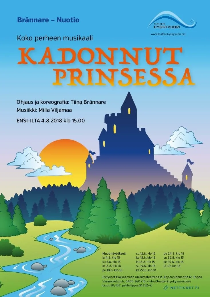 Kadonnut prinsessa saa ensi-iltansa Teatteri Hyökyvuoren iloisena versiona Pakkasmäen kesäteatterissa Espoossa elokuussa 2018.